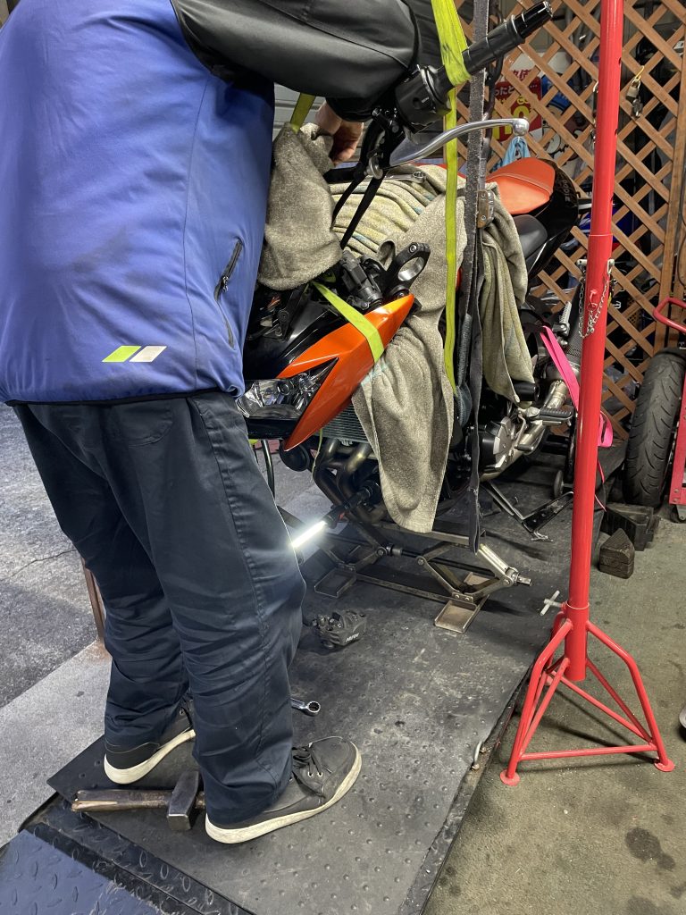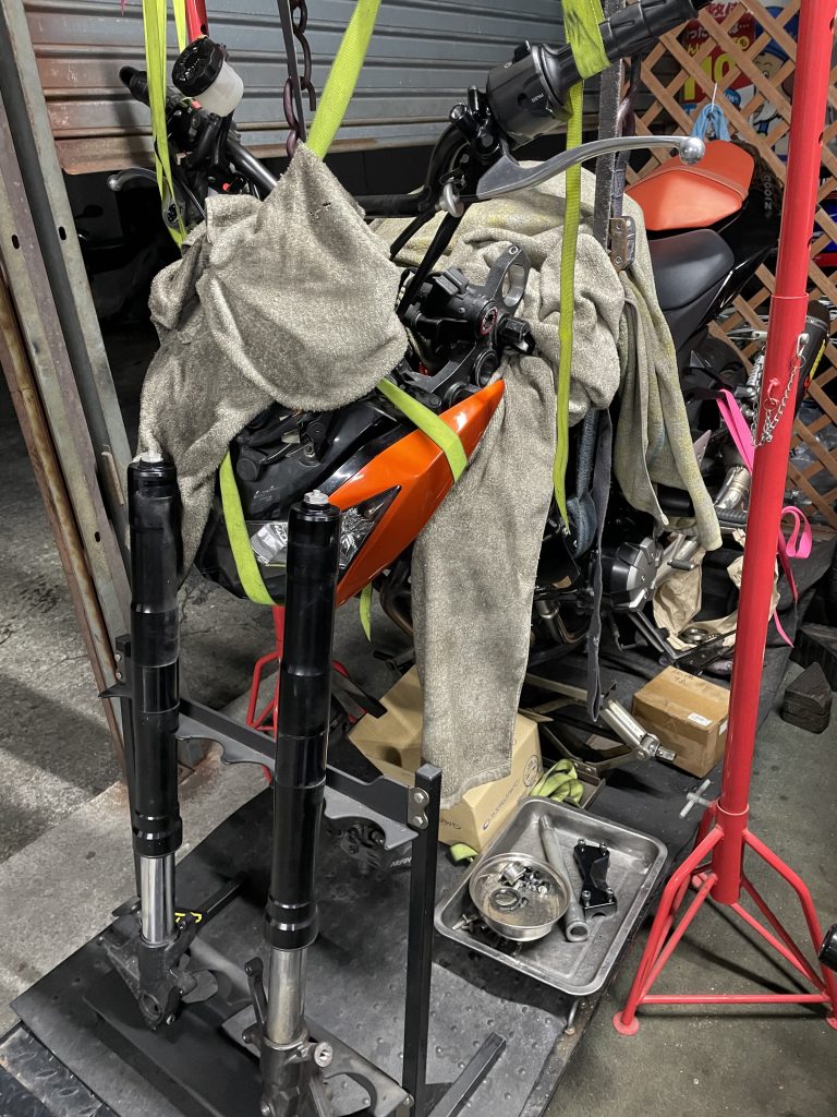 フロント周りを分解し、車体を吊り、